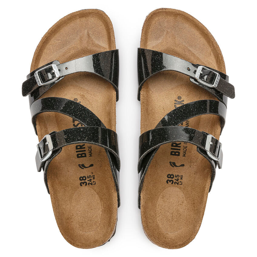Style, comfort and stars align. A high-shine, patent coating gives the Salina sandal a luxe-looking sheen, with subtle sparkles reflective of starry nights. A style-defining strap curves across the foot, drawing the eye between two adjustable buckle closures. Complete with classic BIRKENSTOCK design elements, like a contoured cork-latex footbed for the ultimate in support.
