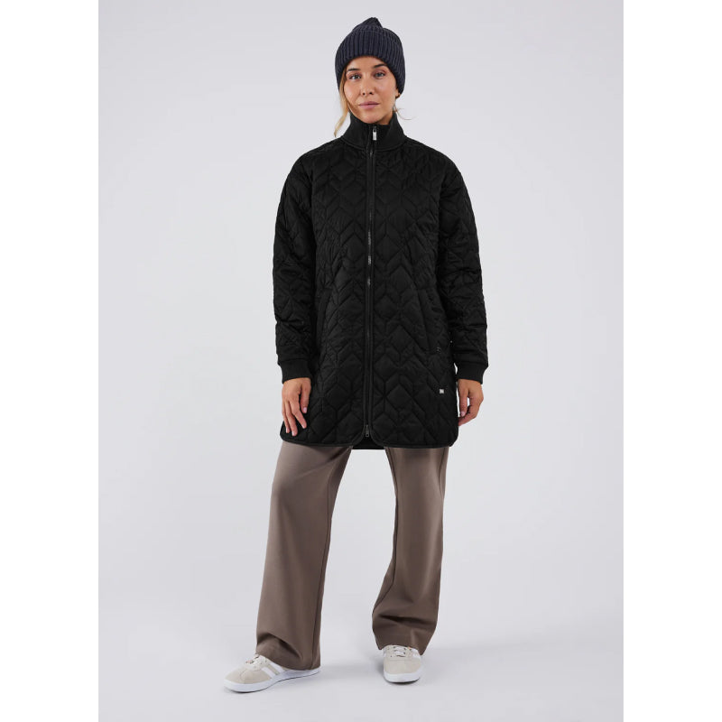 This quilted jacket expertly blends practicality and modern flair, featuring Eco Them™ Quilt's recycled polyester insulation for a lightweight feel. The rib-knit collar and cuffs, Vislon YKK® zipper at the front, and two welt pockets are finished with bias-cut detailing. The insulation is lightweight, water- and wind-resistant, and can be compressed thanks to its short-chain EcoDWR C6 treatment.